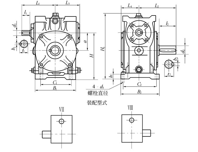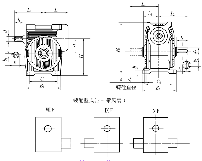 KWO蝸輪蝸桿減速機的外形、安裝尺寸和裝配型式 (mm)