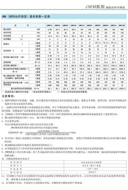 JWM升降機(jī)(梯形絲桿類型)基本參數(shù)一覽表