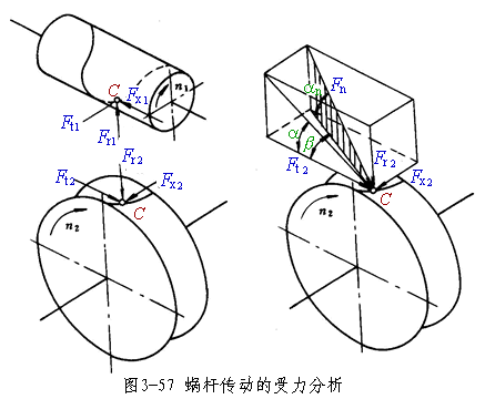 如圖3-57所示的蝸桿傳動(dòng)中,在蝸桿與蝸輪的嚙合點(diǎn)C上,作用著大小相等、方向相反的法向力Fn。這法向力Fn可以分解成三個(gè)互相垂直的分力:切向力Ft、軸向力Fx及徑向力Fr。由于蝸桿軸與蝸輪軸交錯(cuò)成90°,故蝸桿切向力Ft1等于蝸輪軸向力Fx2,蝸桿軸向力Fx1等于蝸輪切向力Ft2,蝸桿徑向力Fr1等于蝸輪徑向力Fr2。它們分別是一對(duì)作用力與反作用力。即: