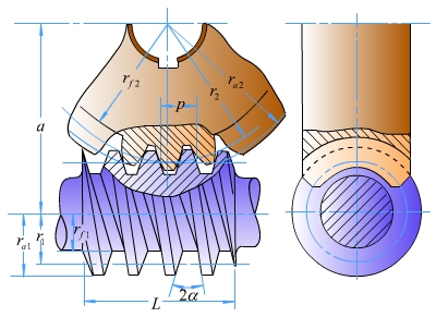 蝸輪蝸桿嚙合傳動中過蝸桿軸線且垂直于蝸輪軸線的剖面稱為主剖面,如圖5.8.2-1所示。在主剖面內反映了蝸桿蝸輪的主要尺寸參數,因此是著重研究的剖面。