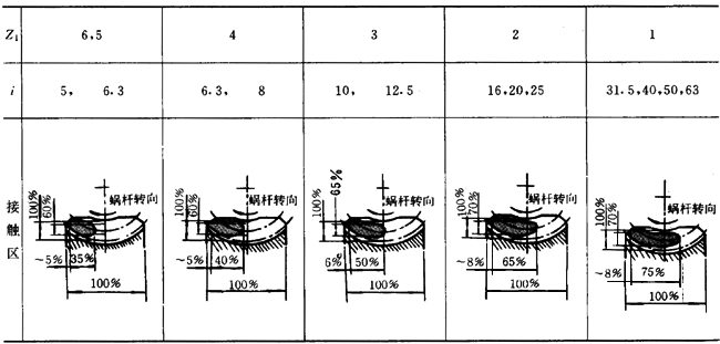 d.蝸輪齒面接觸區(qū)位置、大小應(yīng)符合表8-128的規(guī)定。雙向運(yùn)轉(zhuǎn)時(shí),蝸輪輪齒兩側(cè)接觸區(qū)對(duì)稱對(duì)蝸輪中心平面。